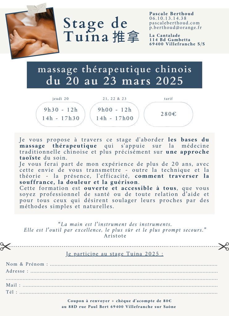 Je vous propose un stage immersif en massage Tuina, pratique ancestrale du massage thérapeutique chinois issue de la médecine taoïste, du 20 au 23 mars 2025.